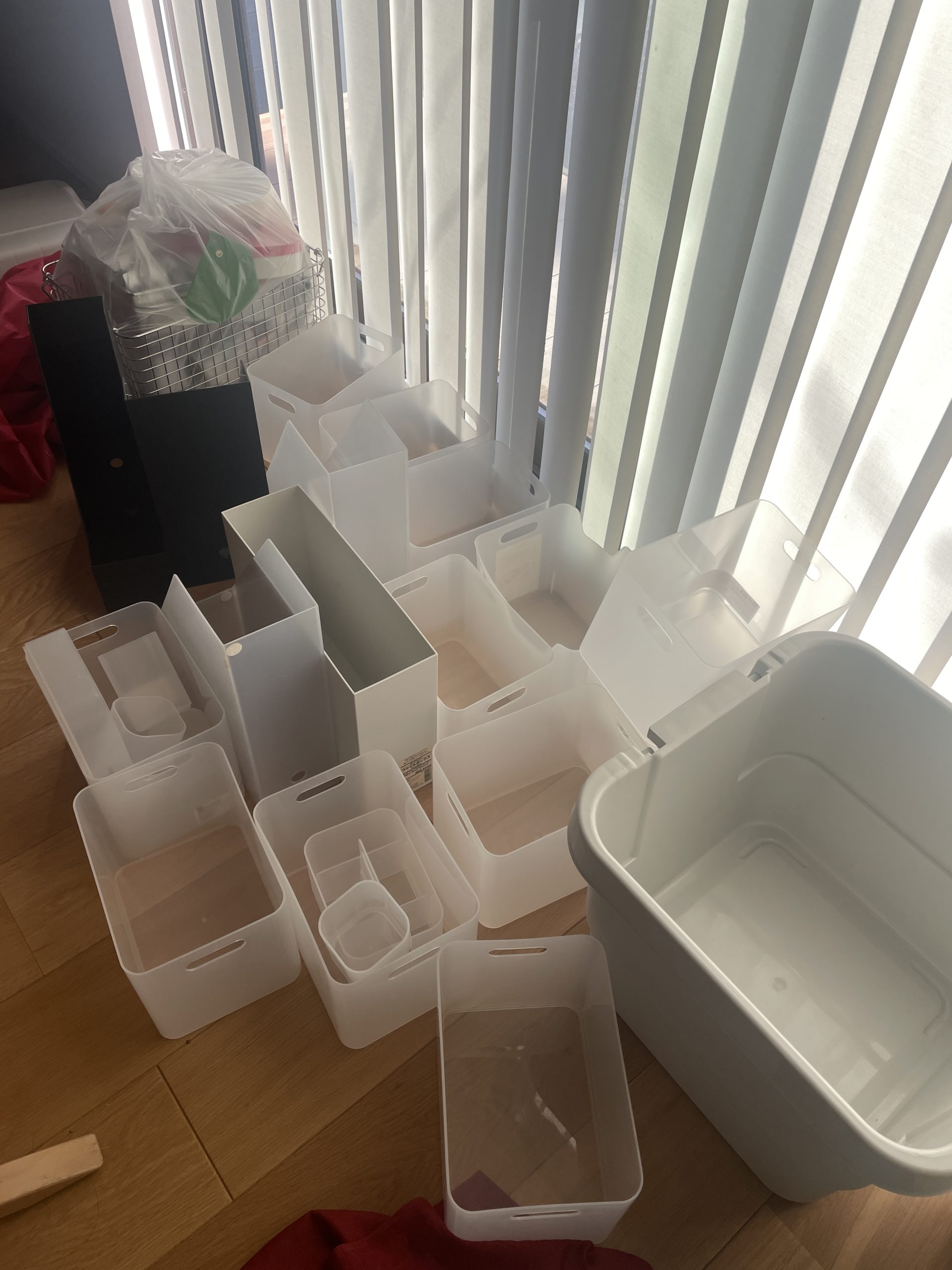 大量の「からっぼの収納ケース」が部屋の隅にずらりと並んだ。